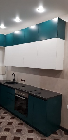 Небесно-голубая кухня с фрезеровкой и диагональными линиями