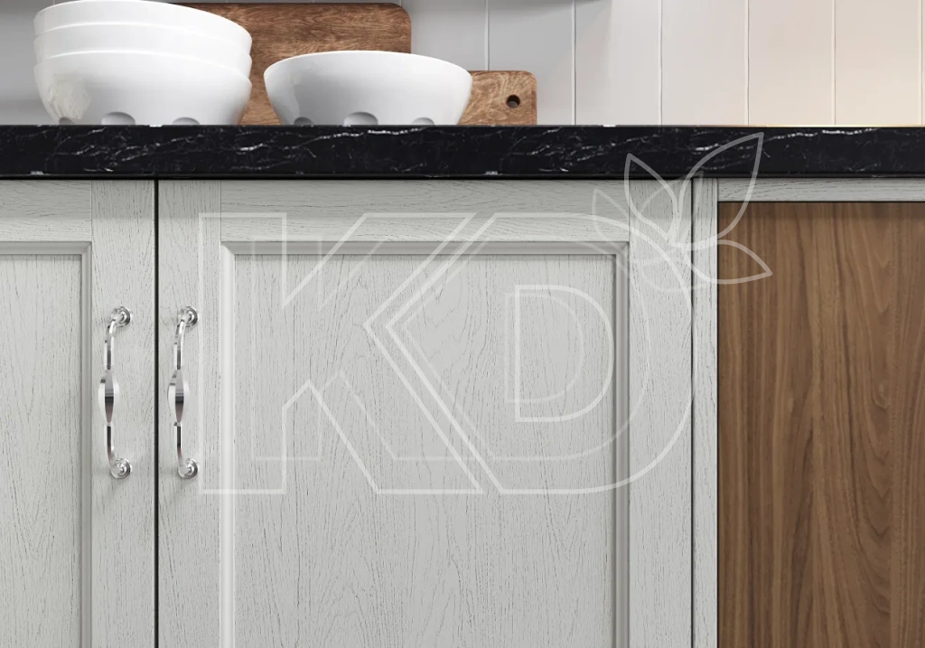 Светлые породы типа ясеня и беленого дуба в сочетании с белыми фасадами выглядят спокойно и невыразительно, но такое решение может подойти тем, кто хочет сделать стены или потолок максимально акцентными и добавить большое количество декора.