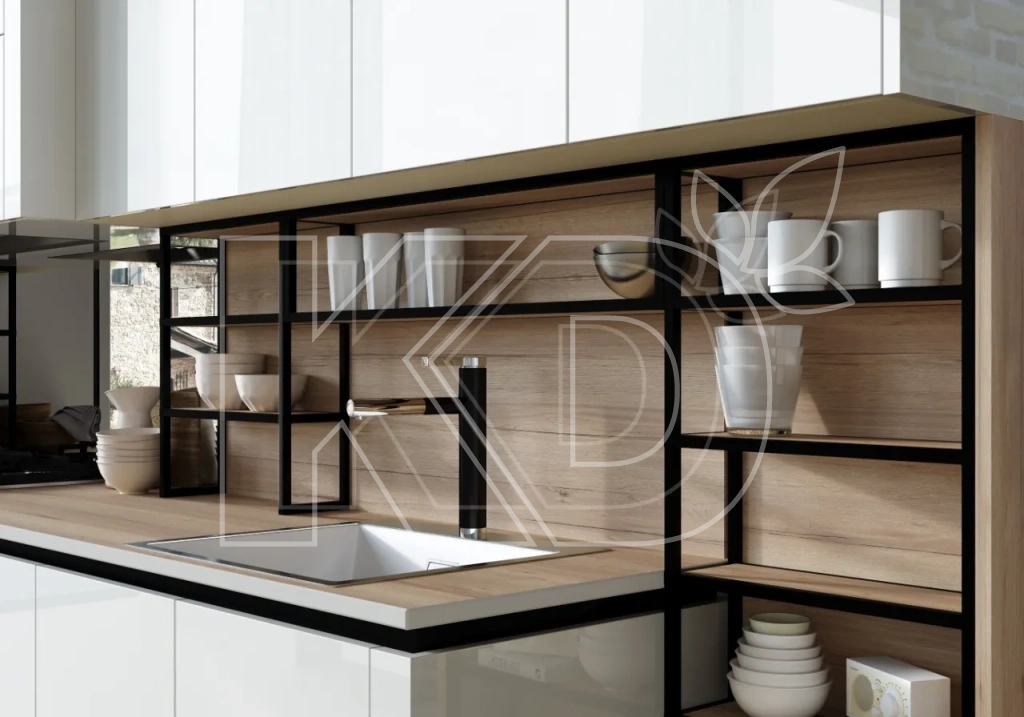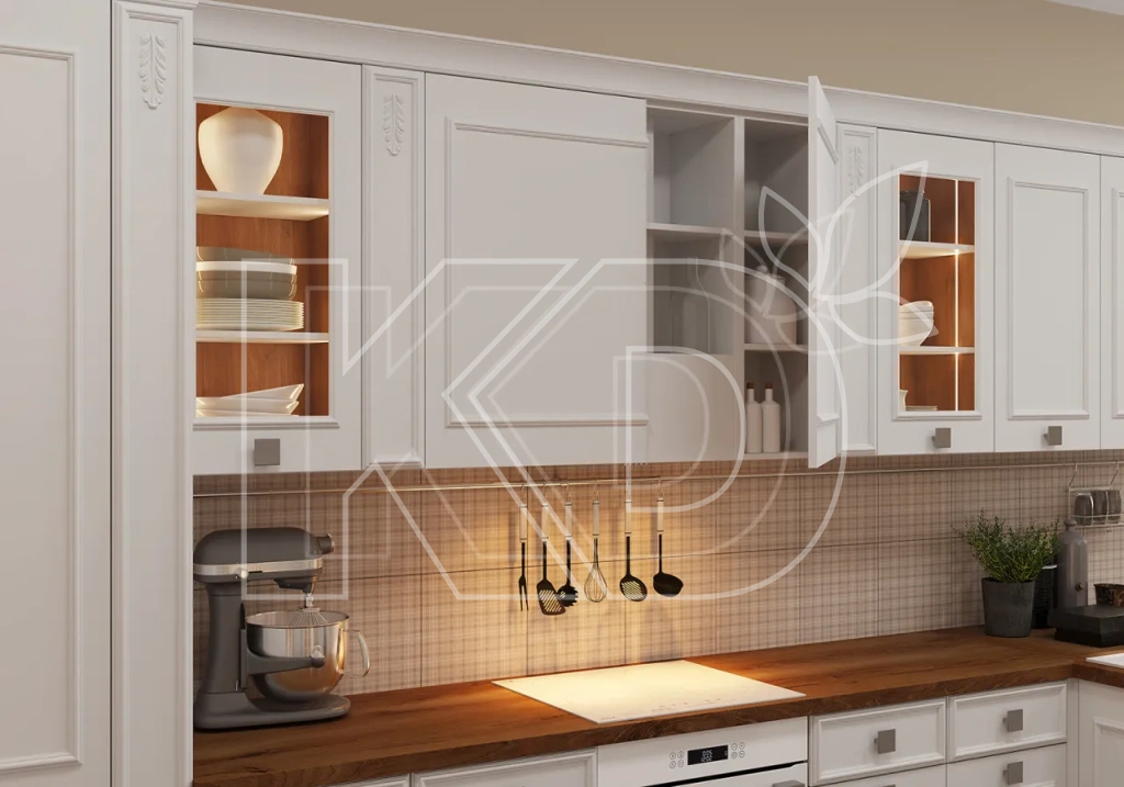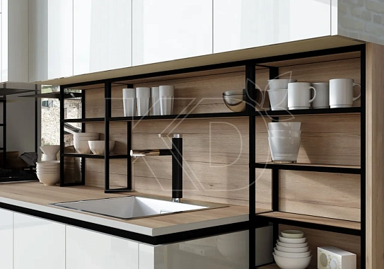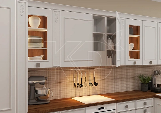 Белая глянцевая кухня с деревянной поверхностью обладает рядом преимуществ: