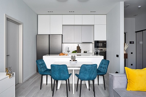 Студийные планировки предполагают открытое пространство, где кухня плавно переходит в гостиную. Здесь важно объединить стиль, подобрать одинаковые материалы для фасадов и столешниц, чтобы пространство выглядело гармонично.