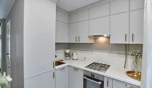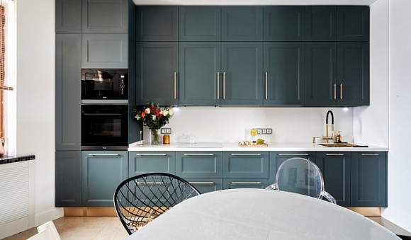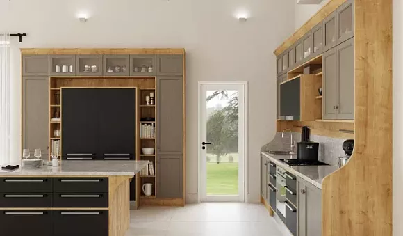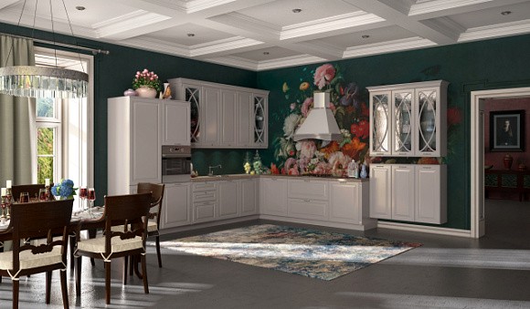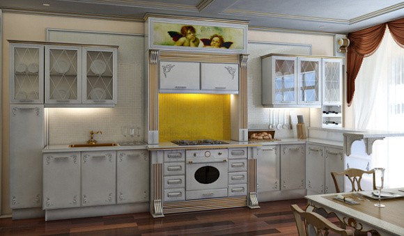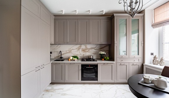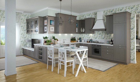 Классический. Серая кухня станет воплощением элегантности и поможет создать атмосферу спокойствия. Мебель для кухни дымчатого цвета оптимально сочетается с кремовыми, белыми или светло-серыми стенами. Также рекомендуется использовать мебель или элементы из натурального массива дерева, а также выбирать серебряный или золотой декор. Но для классики есть одно важное правило – наличие просторного помещения.