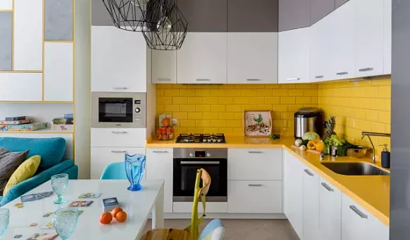 Одно из лучших контрастных сочетаний – серый и жемчужный цвет фартука. Светло-серая мебель в сочетании с графитовым выглядит элегантно.