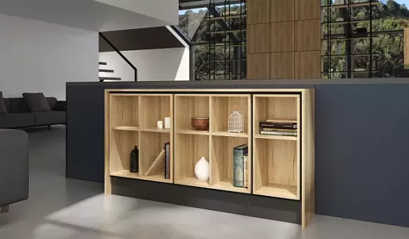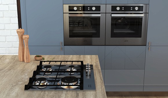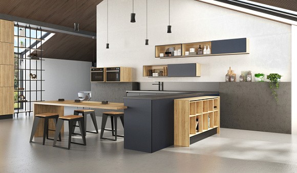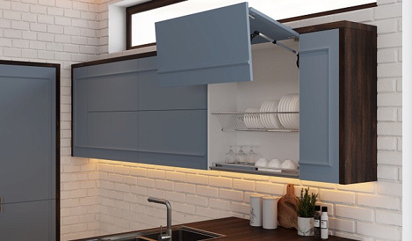 Ключевыми оттенками считаются лазурно-серый, почти на стыке с мятным, а также цвет синей стали. Кухонному гарнитуру в таком направлении характерны: