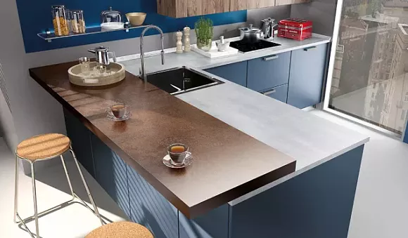 Столешница для кухни. Синяя рабочая область нуждается в теплоте и яркости на стенах. В этом помогут оранжевые тона.