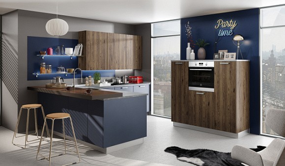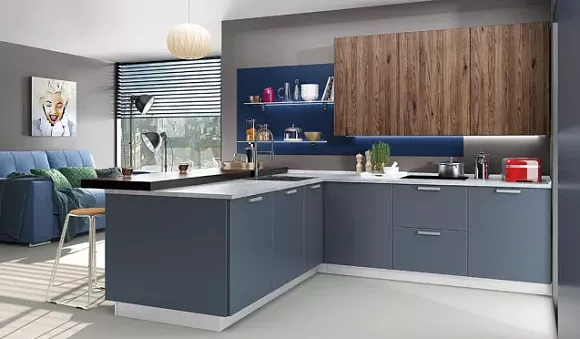 Подбор планировки полностью основывается на числе квадратных метров и конфигурации помещения. Пожалуй, самым востребованным вариантом считается гарнитур в виде буквы Г. В случае с синей мебелью угловая кухня имеет еще одно преимущество: вы можете органично добавлять любой контрастный цвет на иную стену.