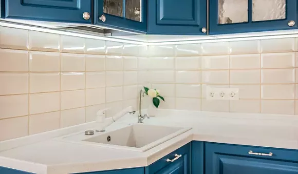 Для синей кухни лучше выбрать оформленный в виде панно фартук с рисунком в морской тематике. В качестве подсветки подойдет светодиодная лента.