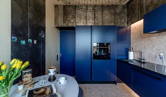 Всю брутальность стиля кухни лофт отлично раскрывает полуночно-синий кухонный гарнитур. Он отлично выглядит на фоне грубой кирпичной кладки и в бетонных антуражах.