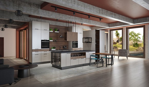 Это стены в виде кирпичной кладки или обычного бетона, деревянные полы, неприкрытые коммуникации (трубы, отдушины, провода и т.д.). Должно возникать ощущение нахождения именно в промышленном помещении. П-образные кухни и кухни с островом отлично для этого подходят, поскольку они используются в большом помещении без лишних стен и перегородок.