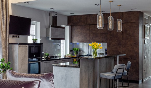 Кухни с полуостровом легко заполняются стильной кухонной утварью, а кухни с барной стойкой в стиле лофт легко сочетаются с практически любыми светильниками. Неотъемлемой частью таких кухонь должна быть современная техника, например, плазменный телевизор на стене или небольшой ноутбук на столике.