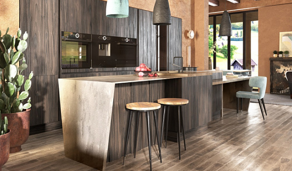 Для больших помещений подходят кухни с островом. С помощью такого гарнитура можно отделить кухонную зону от гостиной. При этом островная конструкция может служить дополнительной рабочей поверхностью, столом для приема пищи, а еще на нее можно вывести мойку или варочную панель.