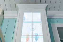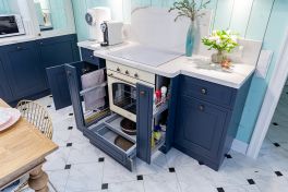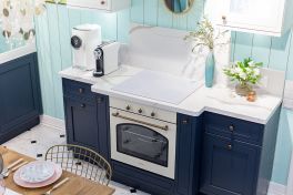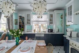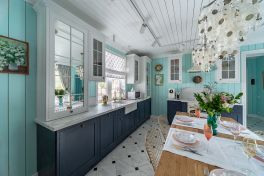 А теперь посмотрим на витражи. В навесных шкафах они прозрачные, а в высоких настольных буфетах – зеркальные. Зеркала позволяют размещать аксессуары, обычно не свойственные буфетам. Например, сушилку для посуды. А ещё зеркальные стёкла визуально расширяют помещение, «облегчая» образ кухни. Этой лёгкости вторит тщательно подобранная по цвету бытовая техника. Белоснежная варочная панель и бежевая духовка гармонируют как с фасадами, так и с роскошной каменной столешницей. Кстати, столешница имеет интегрированную мойку, размещенную прямо напротив окна. Такую мойку всегда приятно использовать, особенно в погожий денёк!